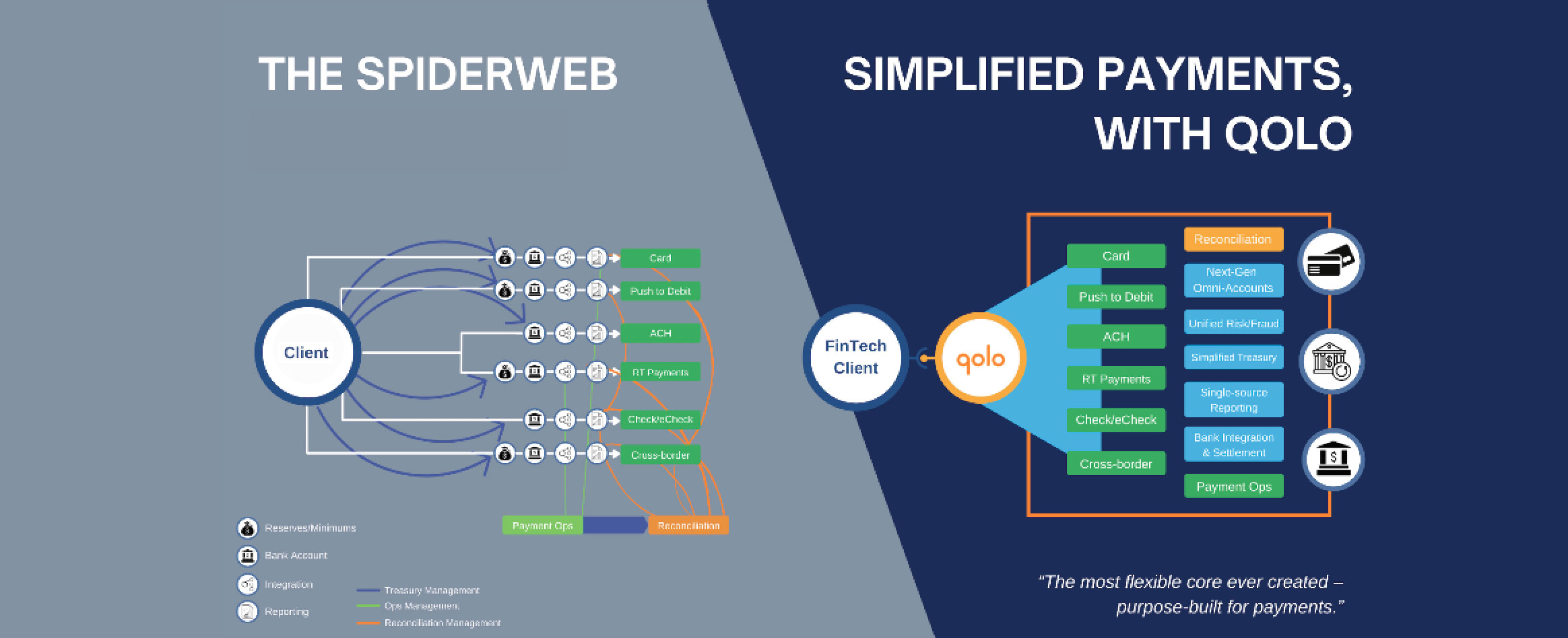 Qolo offers a sophisticated solution to the spiderweb: a single, integrated payments platform that is a first-party provider of all major payments services.